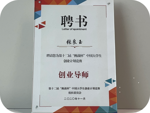 创始人张良玉聘为第二十届“挑战杯”创业竞赛创业导师称号
