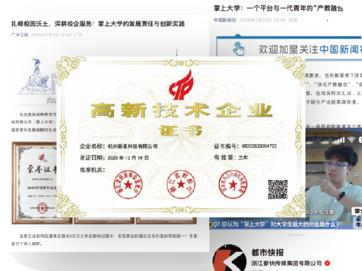 1月,北京、广州、杭州官媒发文高度肯定掌大深度践行“产教融合与青年发展”国家战略,彰显新时代企业的责任担当 掌上大学成功进入持续10年的国家高新技术企业